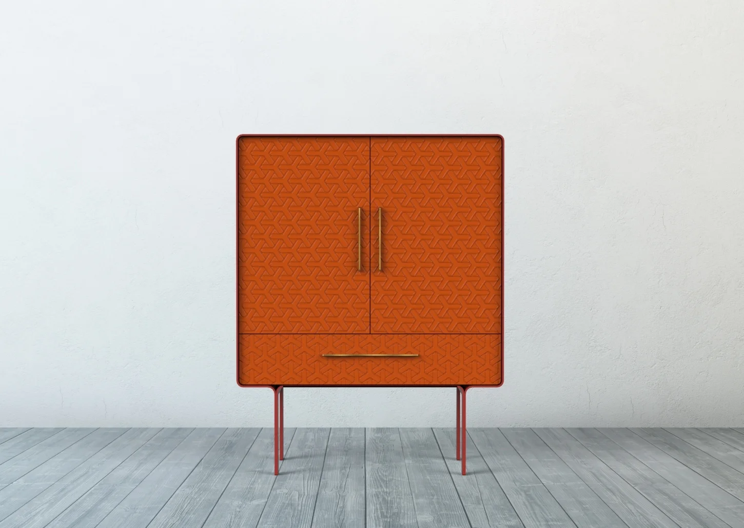 The base is constructed with a tubular steel ring and solid steel rod for the stiles. A small solid band clinches the stiles like a napkin ring to hold all the parts together. The upholstery is made from a fitted comforter with quilting that is placed inside the cage. The upholstered seat goes in last which anchors everything in place. I used polished metals and powdered steel to elevate the design through materials. The color palette of the upholstery reflects the burnt sienna and blues I’ve always been drawn to aesthetically, having been born a child of the 1970s.